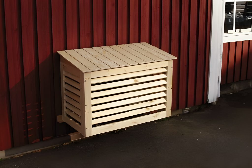 Skydd i obehandlat trä för luftvärmepumpens utomhusdel.